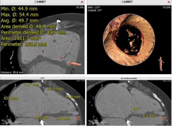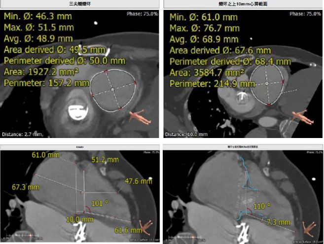患者為68歲女性,14年前因“反復(fù)感冒、氣促”,檢查發(fā)現(xiàn)心臟瓣膜病,接受了“二尖瓣機(jī)械瓣置換術(shù)”。約5年前出現(xiàn)雙下肢水腫,活動后心累氣緊,心臟彩超提示:三尖瓣返流。近年來三尖瓣返流逐漸加重并伴有輕微黃疸、雙下肢水腫,雖長期服用利尿劑治療,但效果欠佳。郭惠明教授團(tuán)隊結(jié)合病史、超聲及CT評估,考慮患者瓣膜置換術(shù)后,三尖瓣重度返流,再次開胸行體外循環(huán)手術(shù)風(fēng)險高,經(jīng)團(tuán)隊整體評估,決定采用最適合患者的LuX-Valve三尖瓣置換系統(tǒng)行微創(chuàng)治療,根據(jù)測量結(jié)果選擇植入JS/TTVI-28-55型號的LuX-Valve瓣膜。