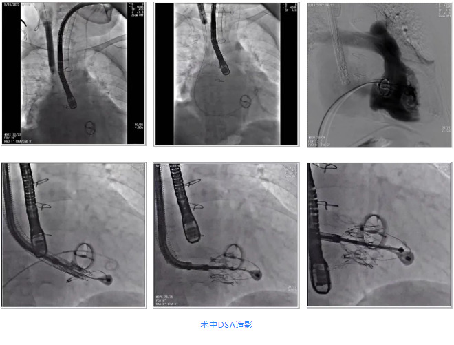 根據(jù)術前評估結果,郭應強教授團隊為患者量身定制了手術策略,決定使用LuX-Valve Plus經(jīng)血管三尖瓣置換系統(tǒng)開展手術治療。手術在全麻下進行,采用經(jīng)右側頸靜脈入路,在經(jīng)食道超聲和DSA的指引下調(diào)整輸送器角度以達到正確位置,勾住前瓣后逐步釋放盤片,盤片打開后順利扎針,最終完成瓣膜植入,輸送器撤出。術后超聲提示人工三尖瓣同軸性良好,瓣架固定牢靠,無反流和瓣周漏,術后三尖瓣平均跨瓣壓差為1 mmHg。