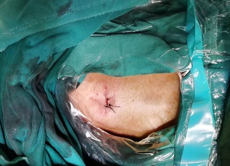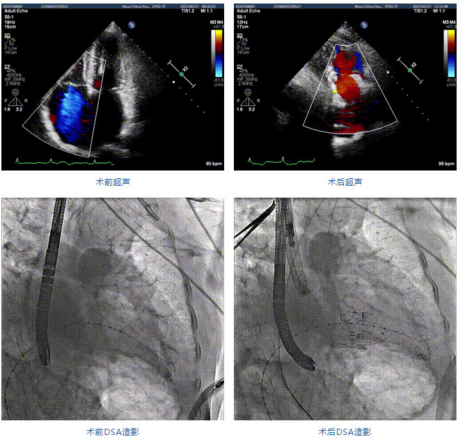 團隊前期經(jīng)過多次討論,制定了周密的手術(shù)策略和預(yù)案。由于患者已是近九旬的超高齡老人,傳統(tǒng)外科開胸手術(shù)風(fēng)險極高,純介入經(jīng)血管三尖瓣替換能夠明顯減少創(chuàng)傷。術(shù)中陳茂及馮沅教授結(jié)合體表定位在造影指示下精準(zhǔn)穿刺右側(cè)頸靜脈并預(yù)置兩把血管縫合器。成功建立經(jīng)皮血管入路后在食道超聲和DSA的引導(dǎo)下順利完成人工瓣膜植入,術(shù)后超聲和造影顯示人工三尖瓣同軸性良好,瓣架固定牢靠,無反流和瓣周漏,平均跨瓣壓差降為1mmHg。術(shù)畢收緊預(yù)置的血管縫合器縫線完成止血,縫合效果滿意,在手術(shù)室即刻拔除氣管插管。