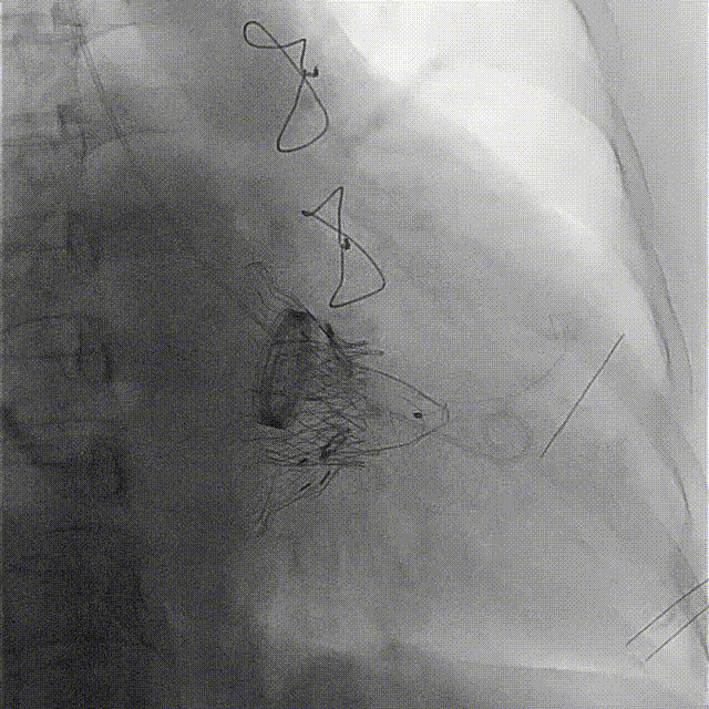 手術在全麻狀態(tài)下開展,海軍軍醫(yī)大學附屬長海醫(yī)院陸方林教授與廈門心血管病醫(yī)院王焱院長共同上臺,為患者進行手術。此次手術采用經右側頸靜脈入路的方式將輸送器送入患者心臟內,在TEE及DSA引導下調整輸送器頭端角度,使得輸送器與三尖瓣瓣環(huán)平面垂直。在輸送器進入右心室后釋放室間隔錨定裝置,而后釋放瓣葉夾持件(2個耳片結構)成垂直狀態(tài)。在TEE及DSA確定夾持件固定至三尖瓣葉根部且位于右室側后釋放人工瓣心房側盤片。隨后調整瓣膜同軸性以及室間隔錨定件位置(貼合室間隔),前推藏針管并固定,進而釋放室間隔錨定裝置,并再次確認瓣膜位置、穩(wěn)定性及同軸性,合攏輸送鞘后撤出輸送器,完成LuX-Valve Plus人工三尖瓣瓣膜的植入。