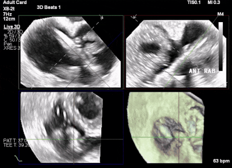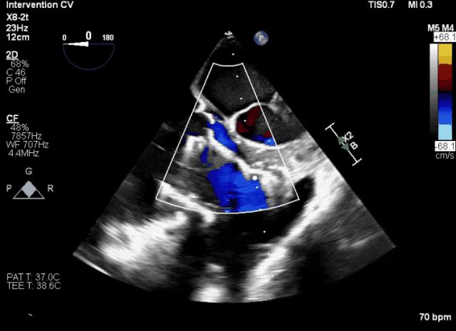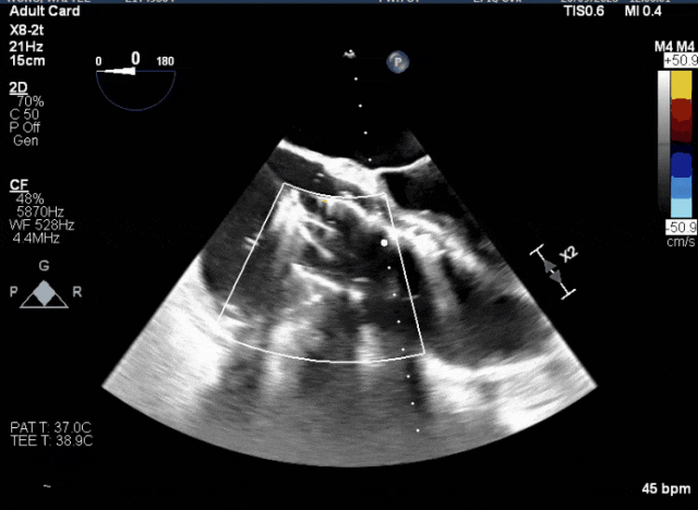 1、患者左心機械瓣術后,術中TEE成像有偽影干擾;2、三尖瓣重度反流,右心房、心室嚴重擴張致三尖瓣葉拴系,Gap:15.3mm,注意阻擋件抓取瓣葉操作。