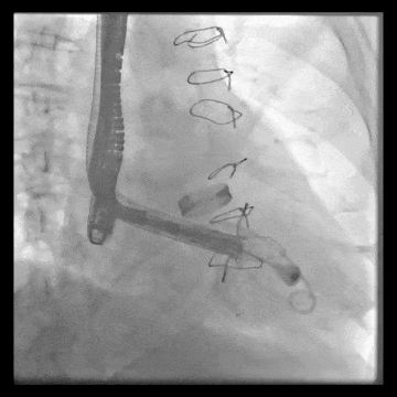 術中DSA顯示起搏器導線的干擾,右心室造影確定瓣環(huán)位置,操作空間小