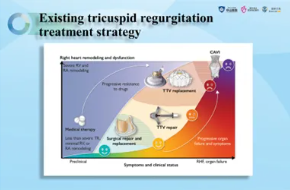 長久以來,隨著學(xué)術(shù)領(lǐng)域?qū)τ谌獍攴盗髡J知的加深,從解剖學(xué)到影像學(xué),從傳統(tǒng)藥物治療到外科手術(shù)治療,針對三尖瓣返流的微創(chuàng)介入技術(shù)一直是學(xué)界關(guān)注的熱點話題之一。結(jié)合三尖瓣返流所并發(fā)的右心系統(tǒng)結(jié)構(gòu)改變,魏來教授首先闡述了現(xiàn)有介入手術(shù)器械在不同解剖條件及不同疾病發(fā)展進程中所面臨的挑戰(zhàn)。作為現(xiàn)有的三尖瓣返流介入治療方案,三尖瓣TEER療法往往受限于三尖瓣返流所帶來的特殊解剖變異,如瓣環(huán)擴張、瓣葉裂隙過大等。
