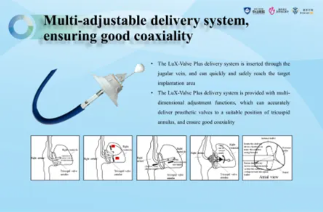 2022年,隨著復(fù)旦大學(xué)附屬中山醫(yī)院的葛均波院士牽頭完成FIM研究并將結(jié)果發(fā)表于國際頂級期刊《Eurointervention》,LuX-Valve Plus獲得國內(nèi)外的廣泛關(guān)注。有別于傳統(tǒng)經(jīng)股靜脈入路三尖瓣介入手術(shù)器械,LuX-Valve Plus創(chuàng)新性采用經(jīng)頸靜脈作為手術(shù)主入路,可將人工瓣膜快速送達目標(biāo)手術(shù)區(qū)域,整體輸送行程較短,有效降低入路周邊解剖組織并發(fā)癥及術(shù)中出血風(fēng)險。同時,魏來教授表示,LuX-Valve Plus輸送系統(tǒng)所具有的聯(lián)動調(diào)彎功能,面對右心房較小的患者,可在進入右心房后快速進行調(diào)彎遞送,從容調(diào)整,快速同軸,降低手術(shù)整體風(fēng)險并安全進行手術(shù)。