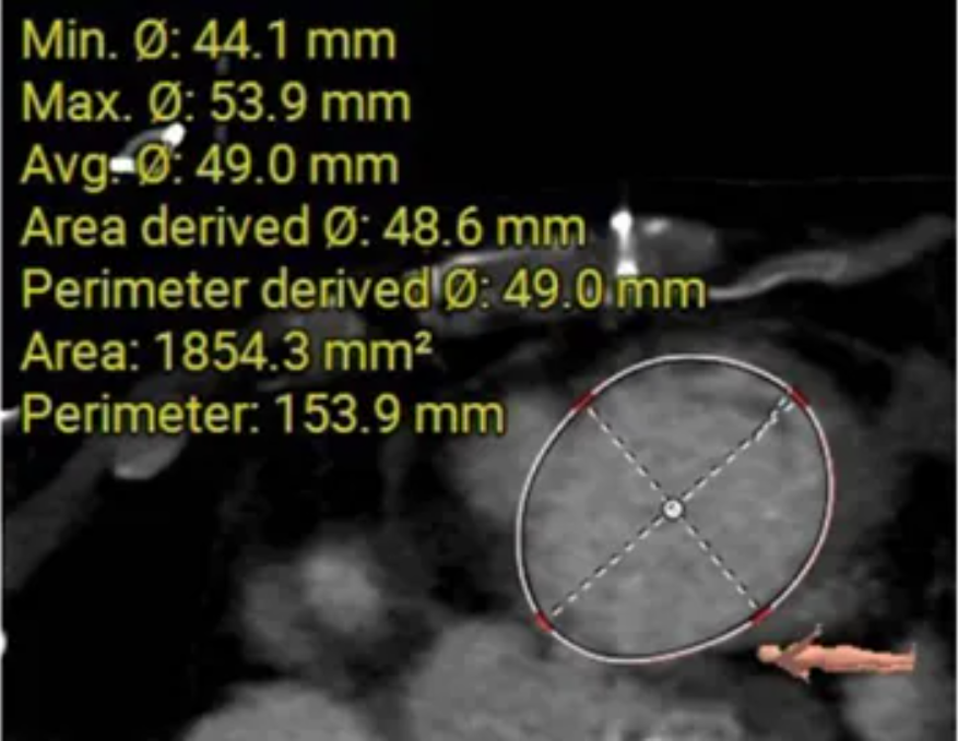 術(shù)前CT測量:三尖瓣瓣環(huán)最大徑53.9mm,周長平均徑49mm,瓣環(huán)顯著擴張。