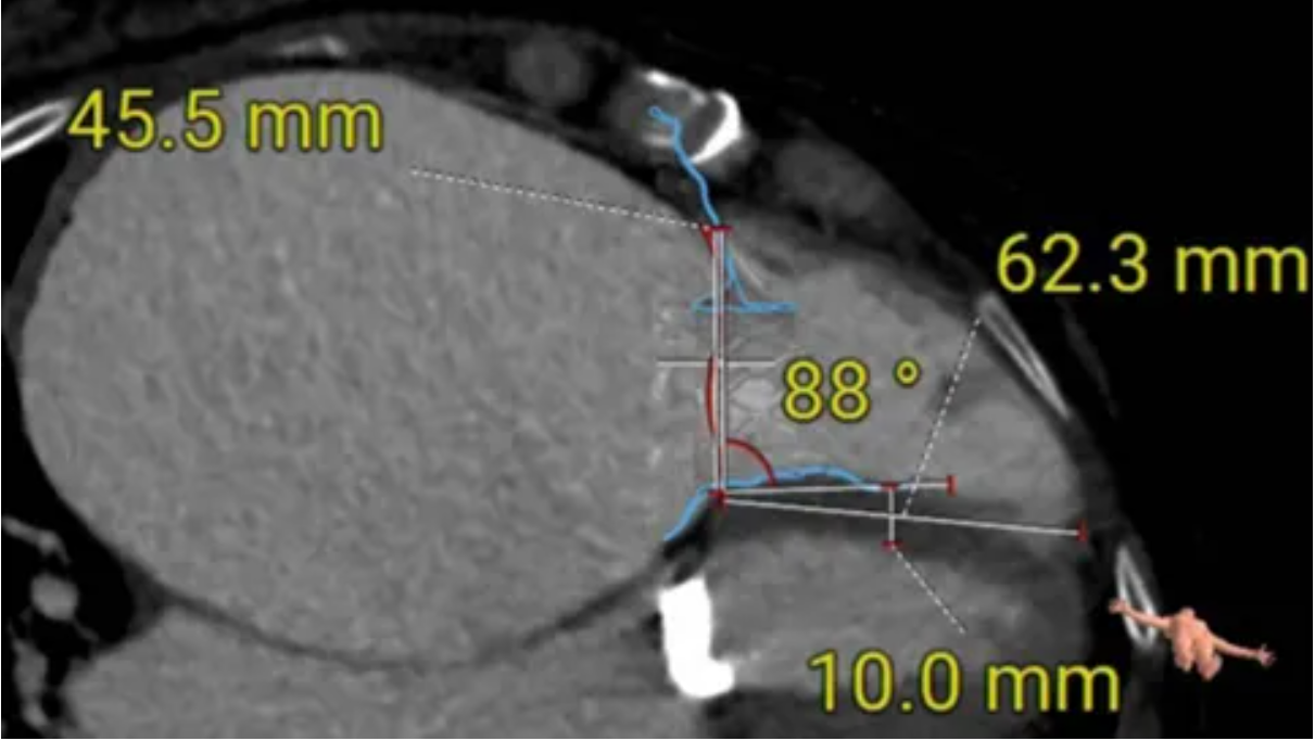 經(jīng)過術(shù)前討論,患者為重度三尖瓣返流,基礎(chǔ)情況差,外科高危風(fēng)險,右心房容積明顯增大,三尖瓣瓣環(huán)顯著擴張,經(jīng)術(shù)前CT測量,三尖瓣瓣環(huán)最大徑53.9mm,周長平均徑49mm,推薦經(jīng)頸靜脈行三尖瓣置換術(shù),推薦使用JS/TTVI-30-55瓣膜。