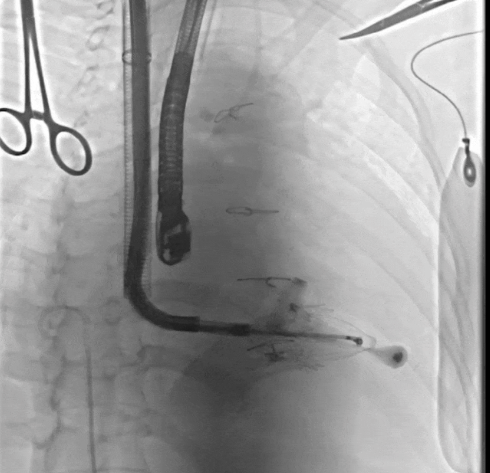 術(shù)中DSA所見:經(jīng)LuX-Valve Plus輸送器系統(tǒng)五向調(diào)整,人工瓣膜同軸良好,夾持件均在瓣葉下。