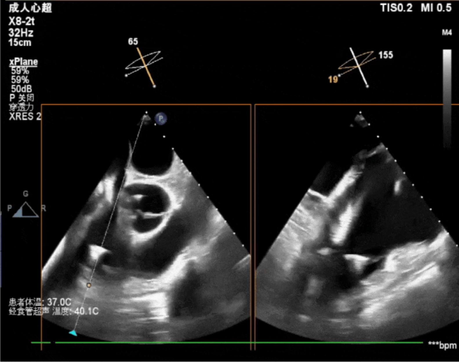 術(shù)后即刻經(jīng)食道超聲可見(jiàn),三尖瓣假體瓣膜位置合適,牛心包瓣葉運(yùn)動(dòng)狀態(tài)良好,開(kāi)閉正常,瓣周及瓣葉對(duì)合緣處未見(jiàn)明顯返流,心電圖及心包狀態(tài)較術(shù)前無(wú)明顯變化。