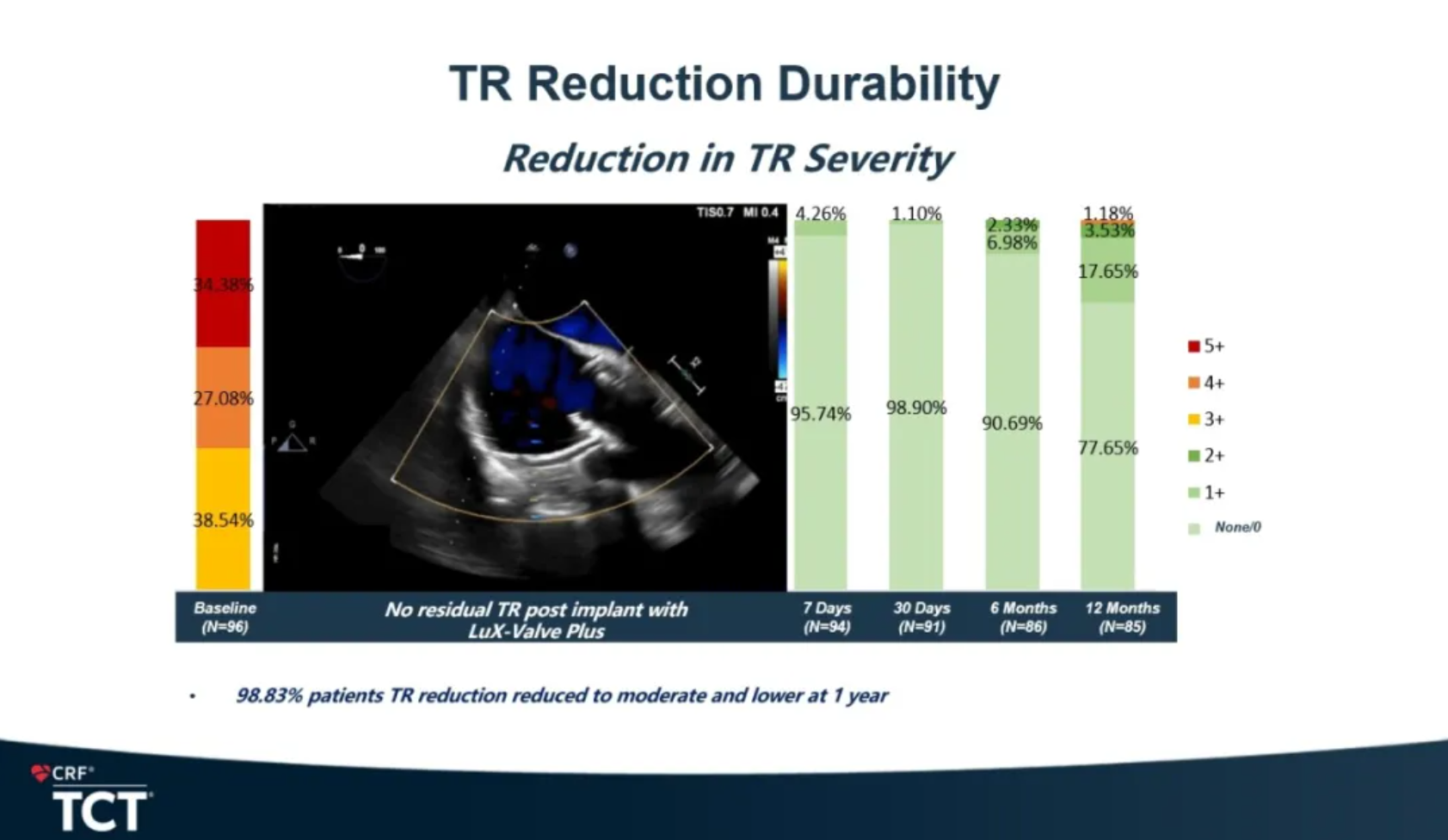 有效性數(shù)據(jù)顯示,LuX-Valve Plus在大瓣環(huán)患者的植入是非常有效的。在隨訪一年時(shí),98.59%的患者反流等級恢復(fù)到中度及以下。Thomas Modine教授提到,對于TTVR的使用來說反流等級的消除是非常重要的,而不僅僅是降低,且對于大瓣環(huán)患者來說就更具有挑戰(zhàn)性了,所以對于很多正在治療的患者來說這是一個(gè)非常好的結(jié)果。